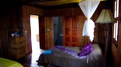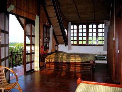 offrent 3 types de logement: Les prix sont compris entre 14$ la chambre double avec salle de bain partagée et 105$ pour la grande maison d'hôtes (3 chambres) Bungalows Chaque bungalow de bois offre une chambre spacieuse, une salle de bain privée et un balcon privé ou une terrasse avec vue sur la rivière. Ils sont tous situés le long des rizières et connectés par des chemins de pierre aux autres parties de notre complexe. Notre bungalow